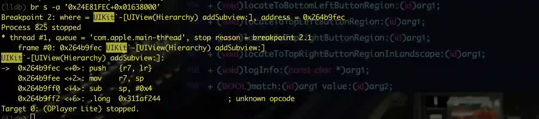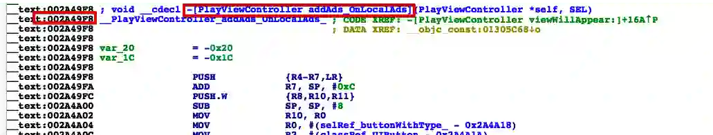 可能其他的逻辑未必跟我符合. 但是一定必然的是, 这个adsView 必须是addSubview上去的,addSubview是UIKit中view的方法, 咱们需要静态分析这个地址, 通过断点来查看它对应的调用者/参数, 从而拿到地址,来定位到OplayerLite