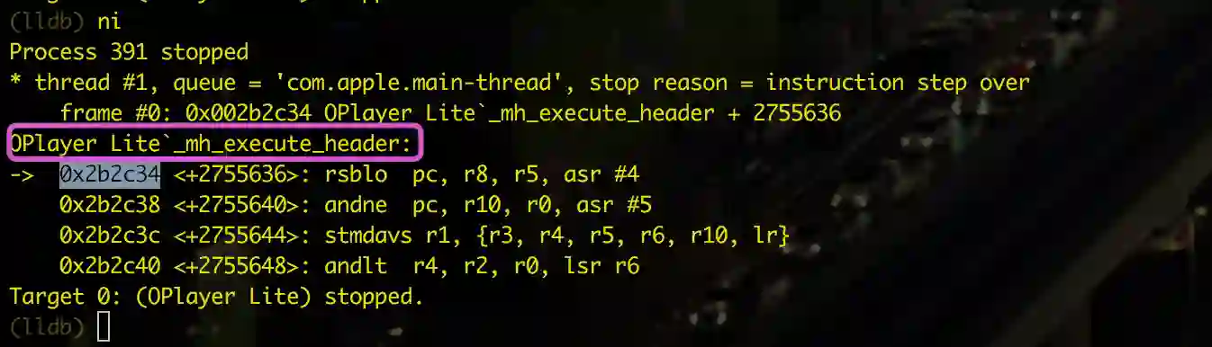 在lldb下断点,记得加上上面看到的偏移,如: