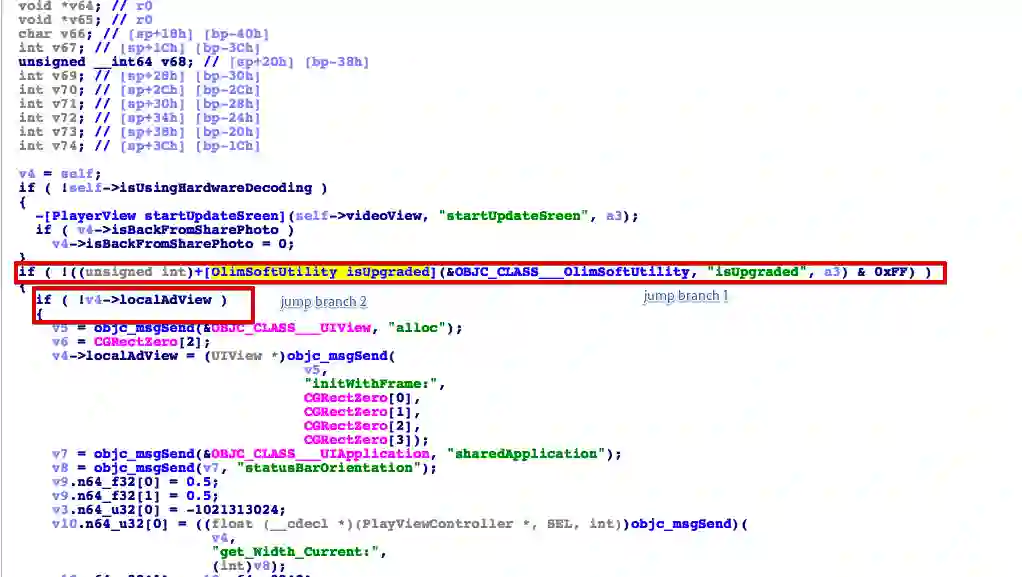 伪代码的意思是+[OlimSoftUtility isUpgraded]的返回值和 #0xFF 进行了逻辑与的运算, 理解到 #0xFF 是非0类型必为真, 而现在只需要+[OlimSoftUtility isUpgraded]能返回真即可跳过这段代码. 这个猜想是否正确,毕竟是伪代码,所以需要对汇编部分进行确认: