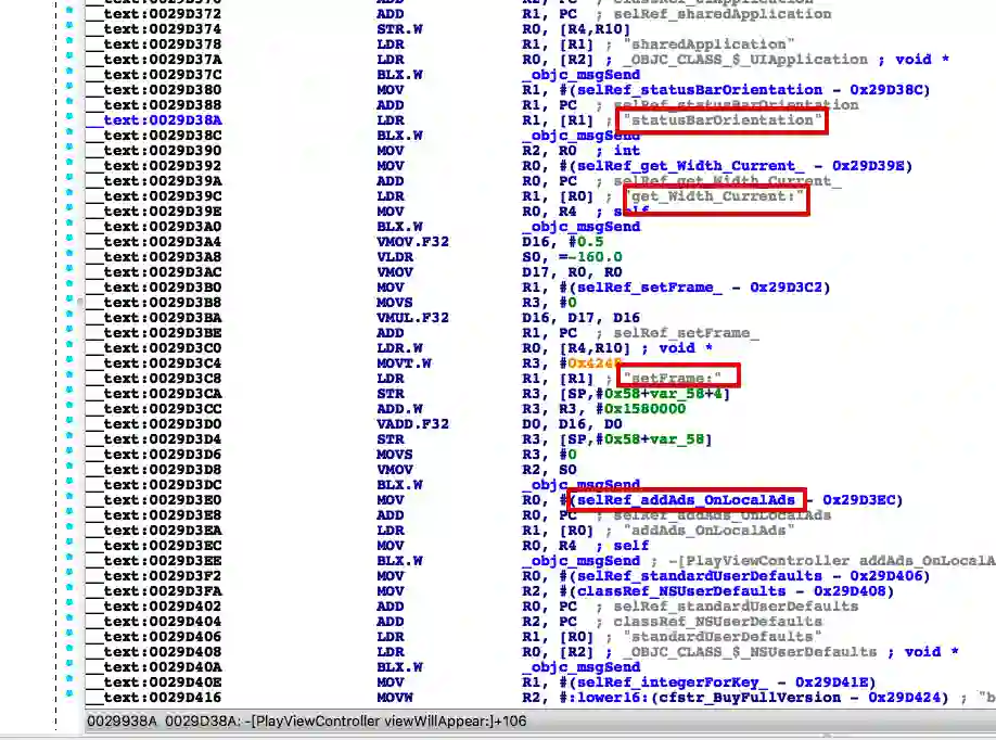依然借助IDA分析, 可以看到msg_send的一些部分是相关的设置方向, frame, getWidth等方法, 而调用的位置就在viewWillAppear:这里.