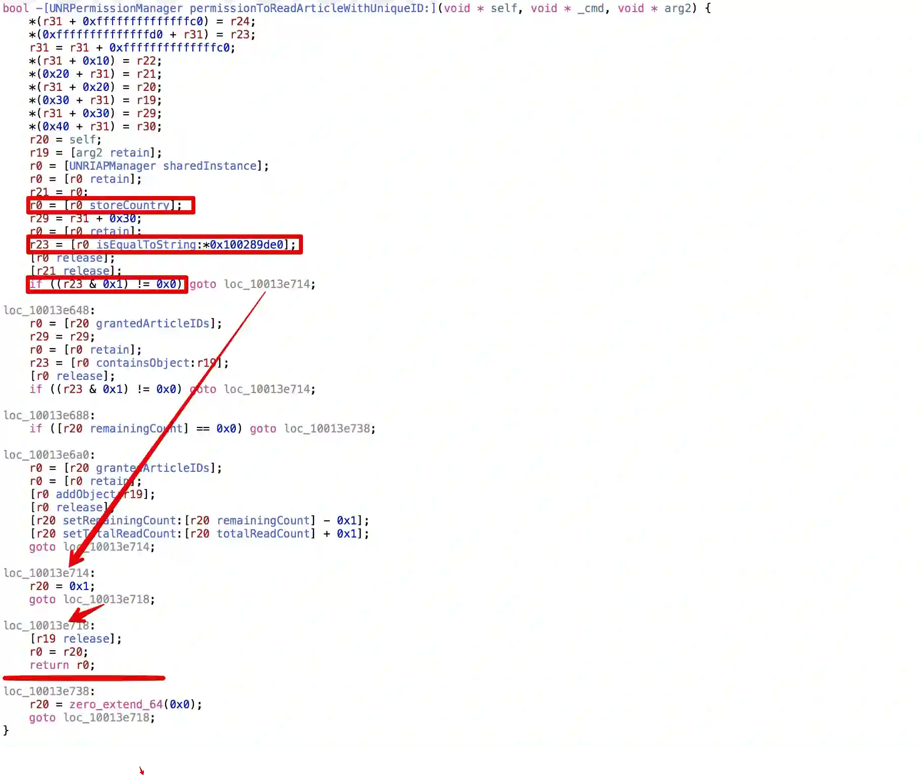 storeCountry返回了一个string类型, 与0x100289de0这个地址的值进行了比较, 如果相等则直接跳转到地址0x10013e714,并赋值为0x1即不为假的, 继而跳转到0x10013e718,返回真.
