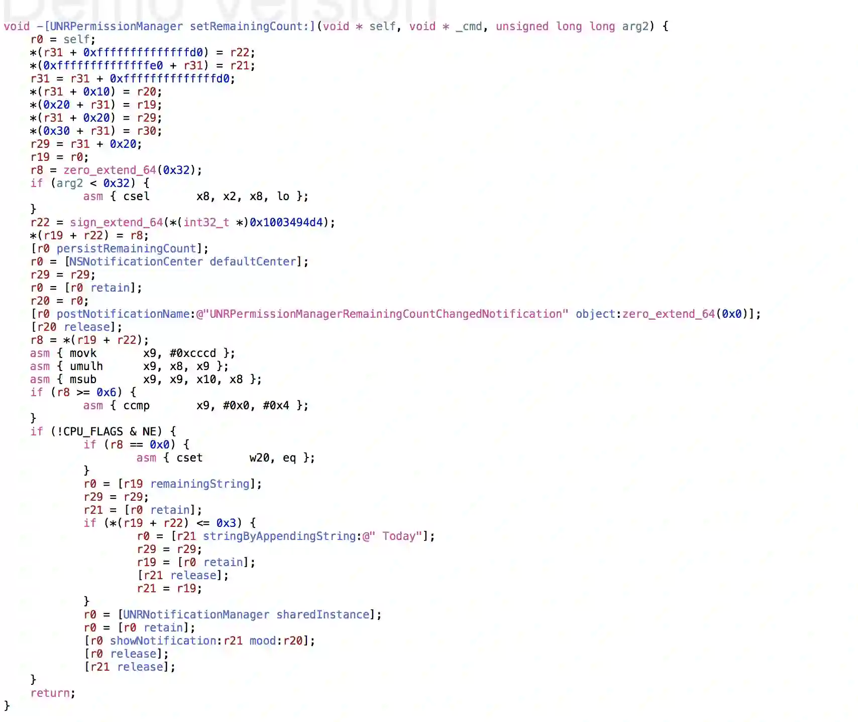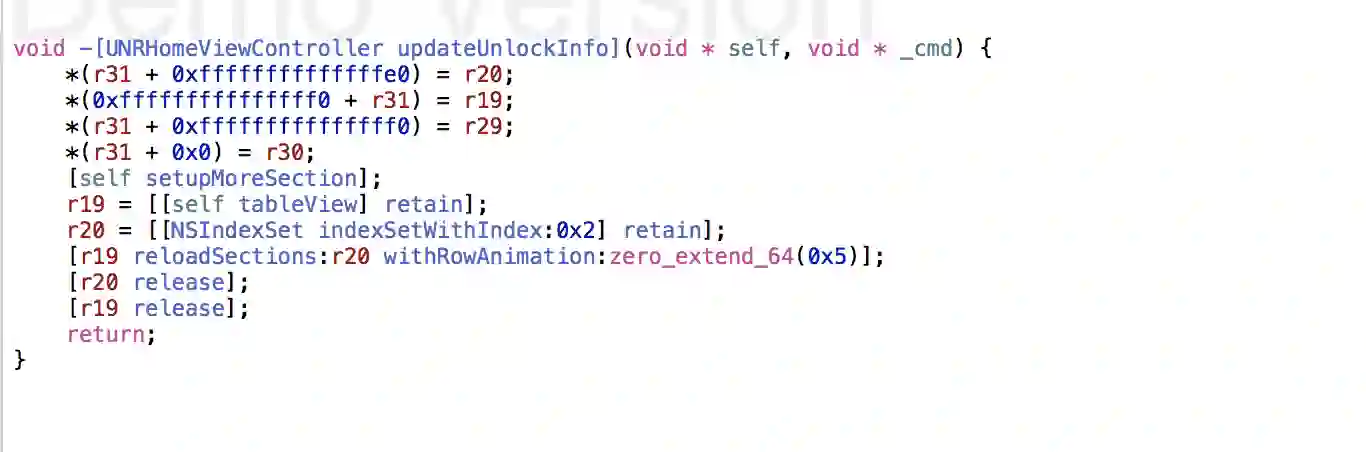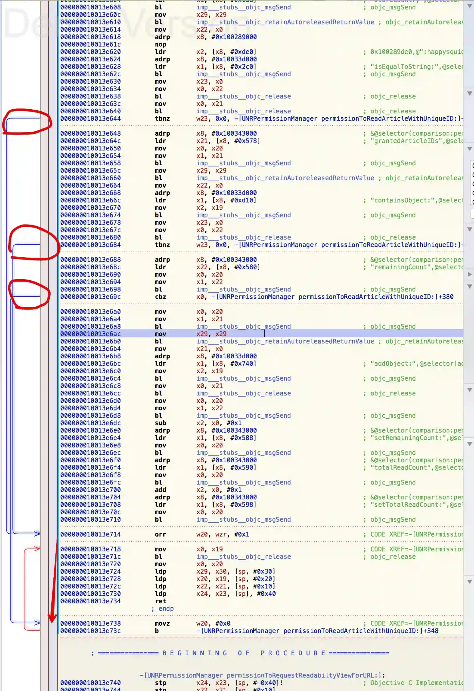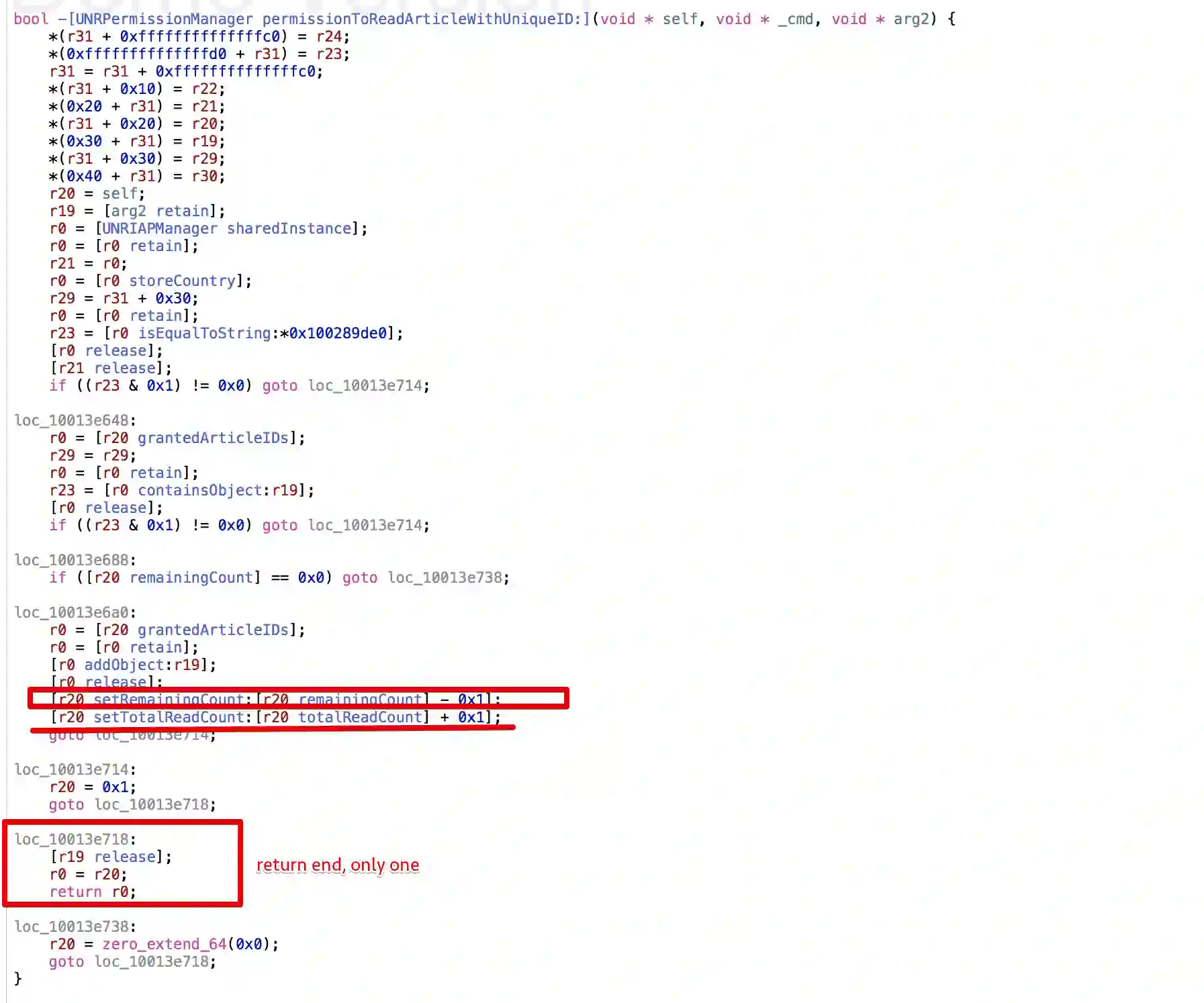 那么线索就继续追溯到上层调用permissionToReadArticleWithUniqueID, 从hopper找到并查看,翻开伪代码可以看到如下:
