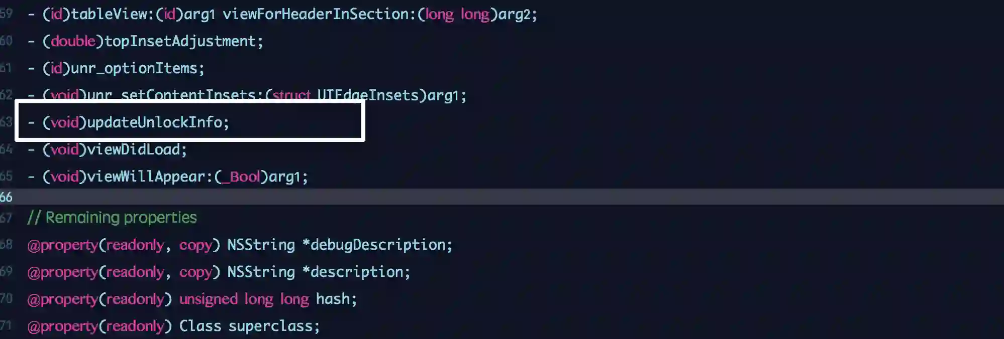 把class-dump出来的头文件拖到Xcode项目, 搜一下”NSRHomeViewController.h”可以看到这个头文件, 所幸头文件不多,我有了部分时间慢慢看这些方法,尝试发现敏感名称, 其中最让我敏感的是这个: