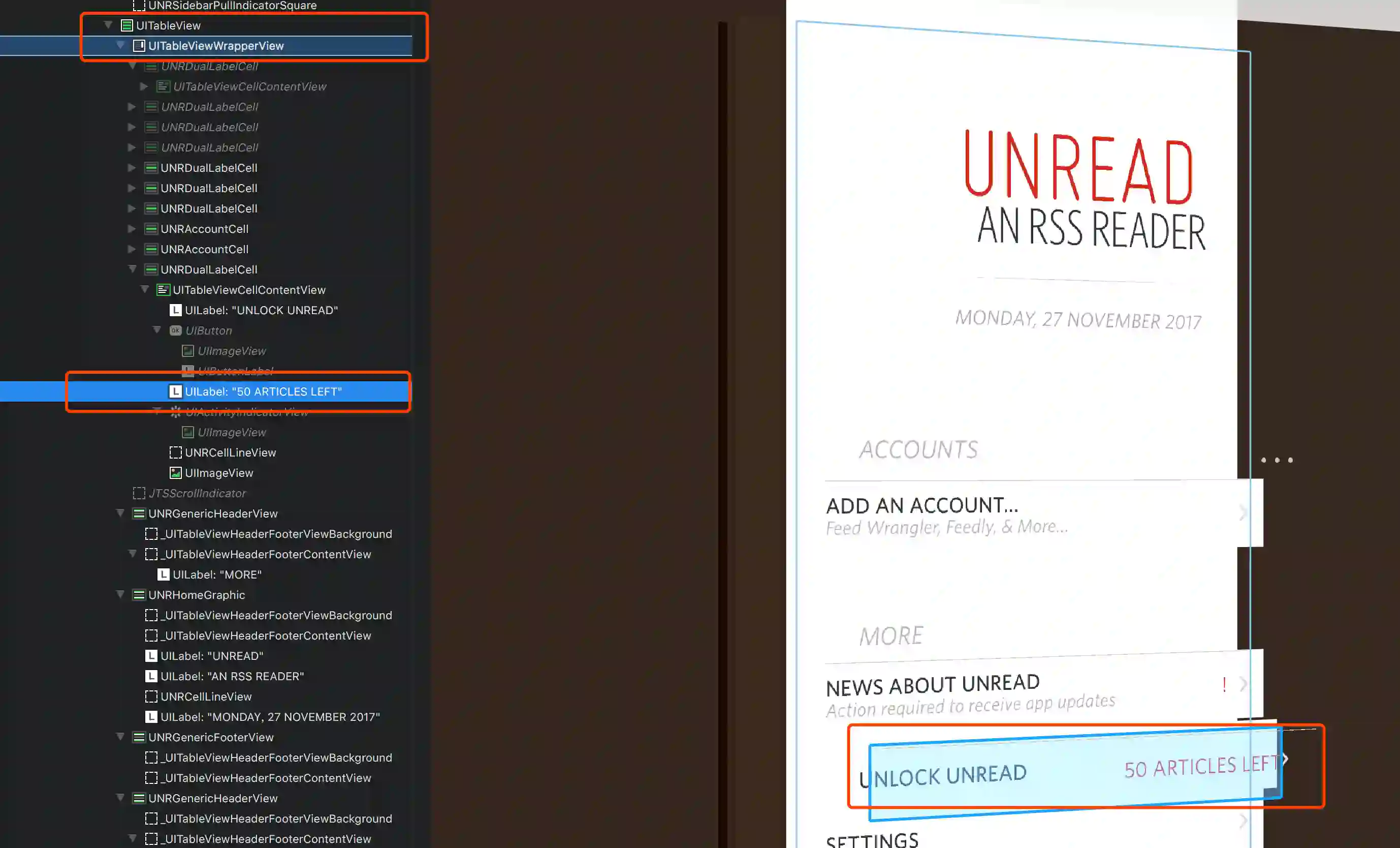 reveal启动后点到我们目标view,可以看到这是一个tableview的cell,”50 ARTICLES LEFT”是cellContentView的label, 查看右边, 我们能看到这个页面的控制器.