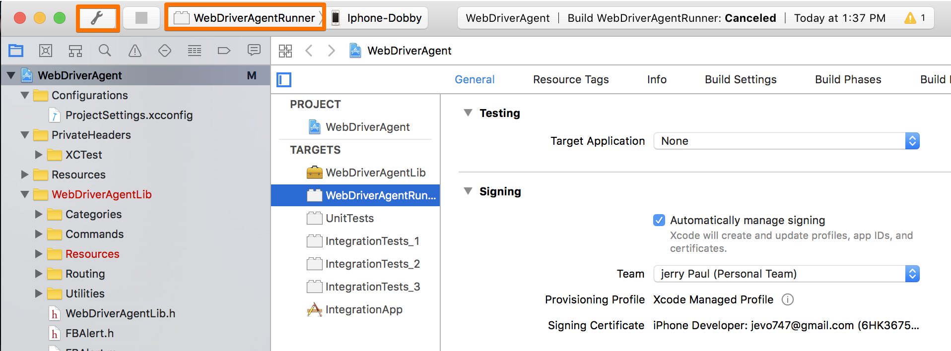 xcode打开,选择Target是WebDriverAgentRunner,Test到手机(签名用个人Appid就可以,然后Test到手机后,信任一下证书)