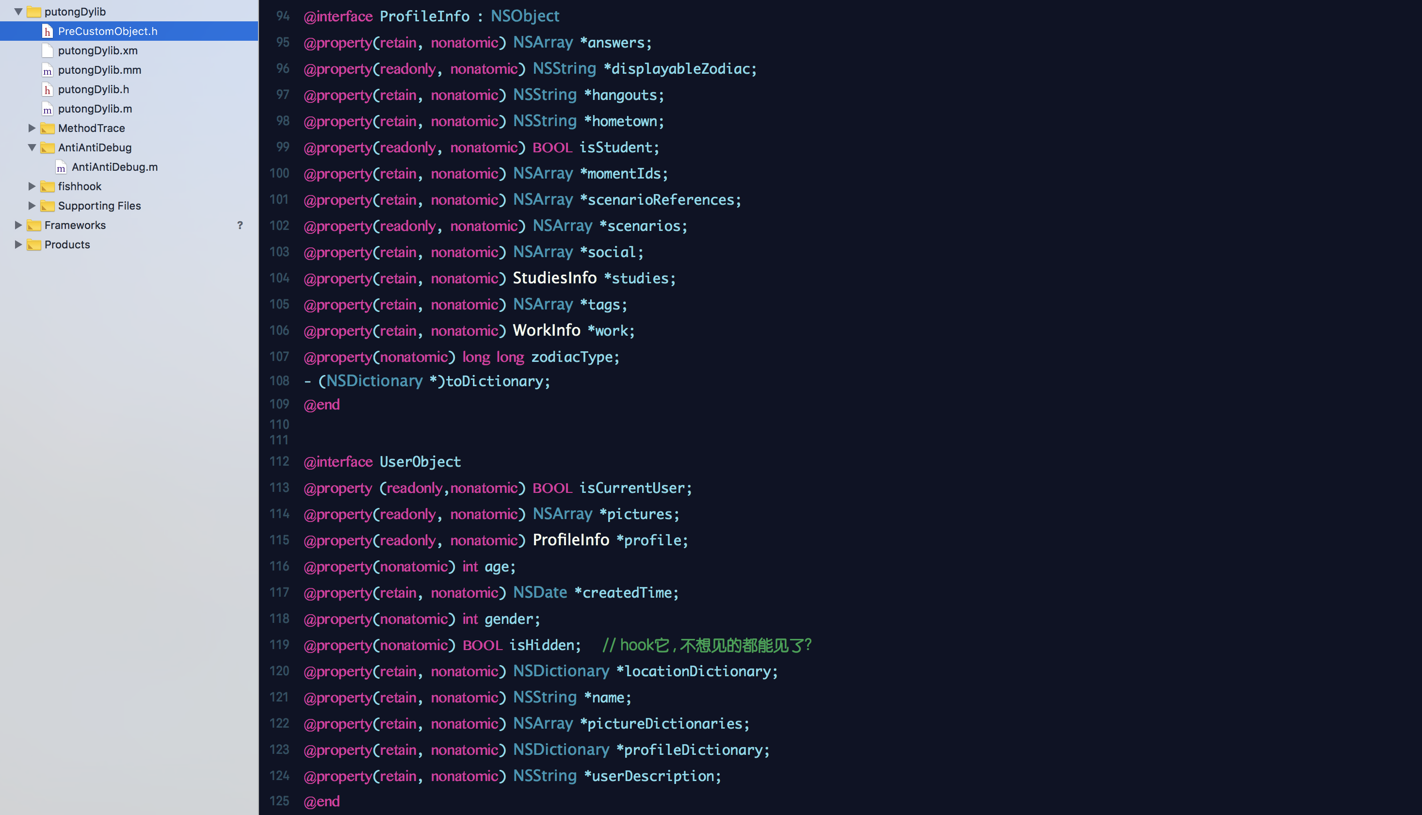 其中,我把这些我需要hook用到的头文件,从class-dump出来的抽出来, 进行@interface一下,来欺骗编译器,如果是@property就不需要继承什么, 如果是方法,报错的话可能需要继承NSObject或其他已定义的: