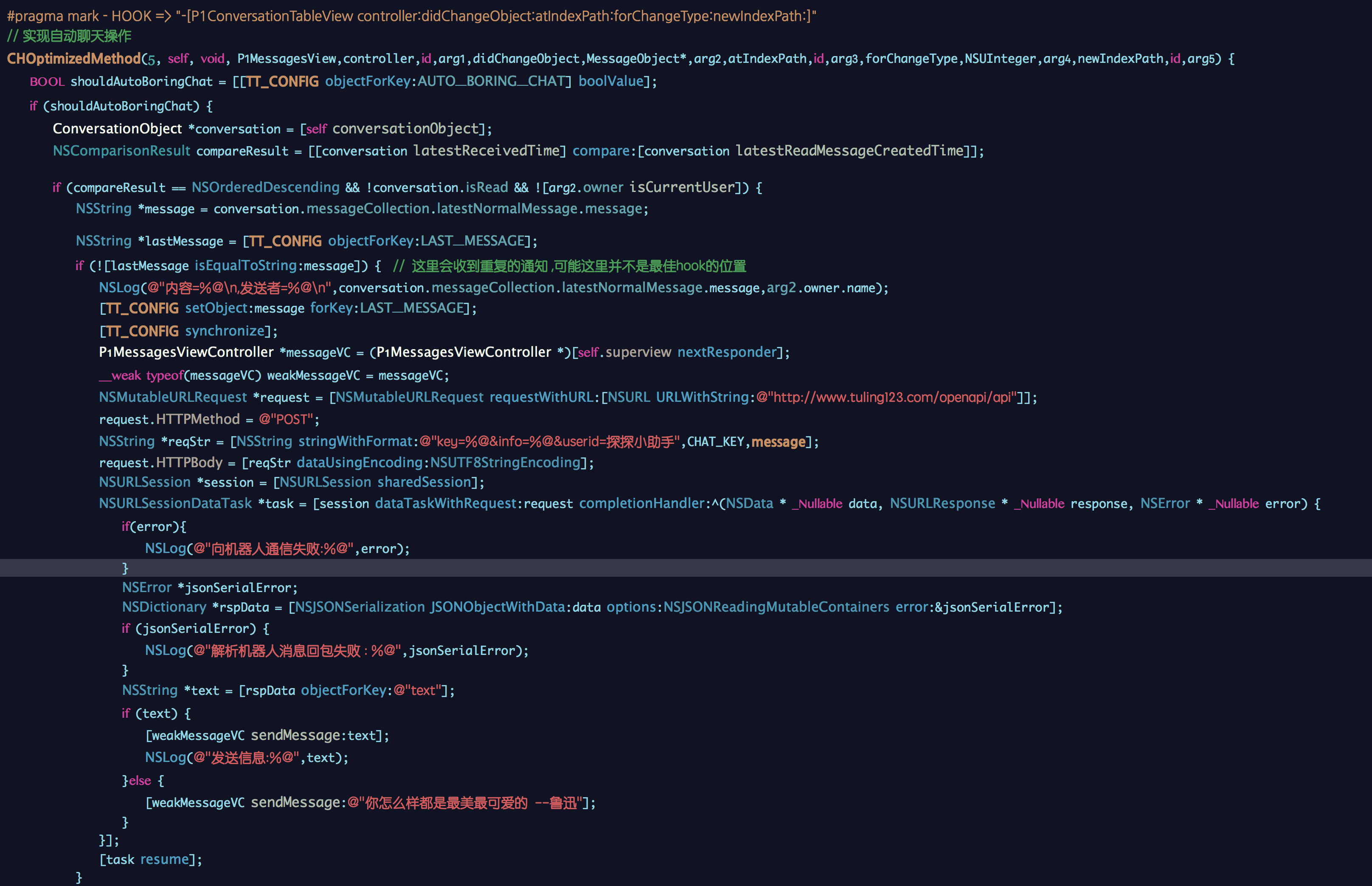 网络请求很粗糙了使用了NSURLSession,但能保证内存是不会问题.#pragma mark - HOOK => "-[P1ConversationTableView controller:didChangeObject:atIndexPath:forChangeType:newIndexPath:]"