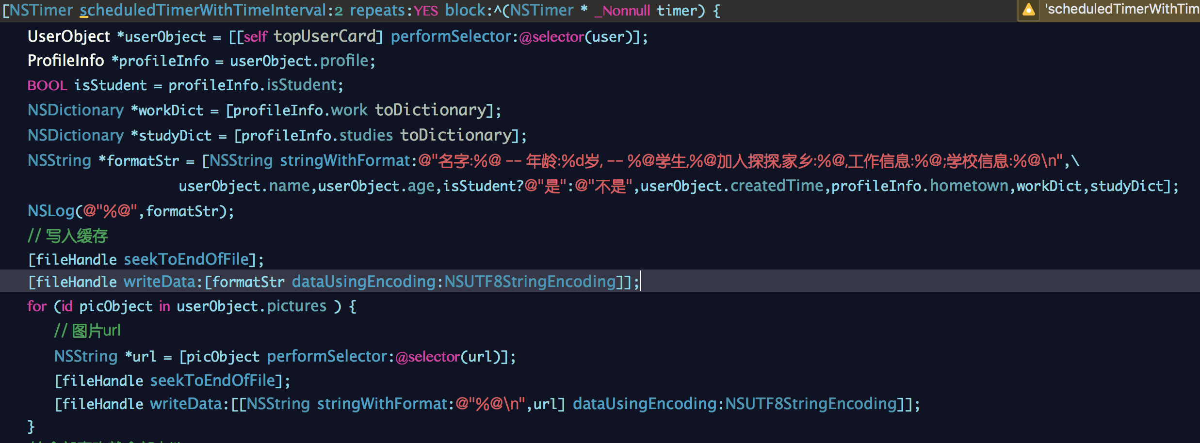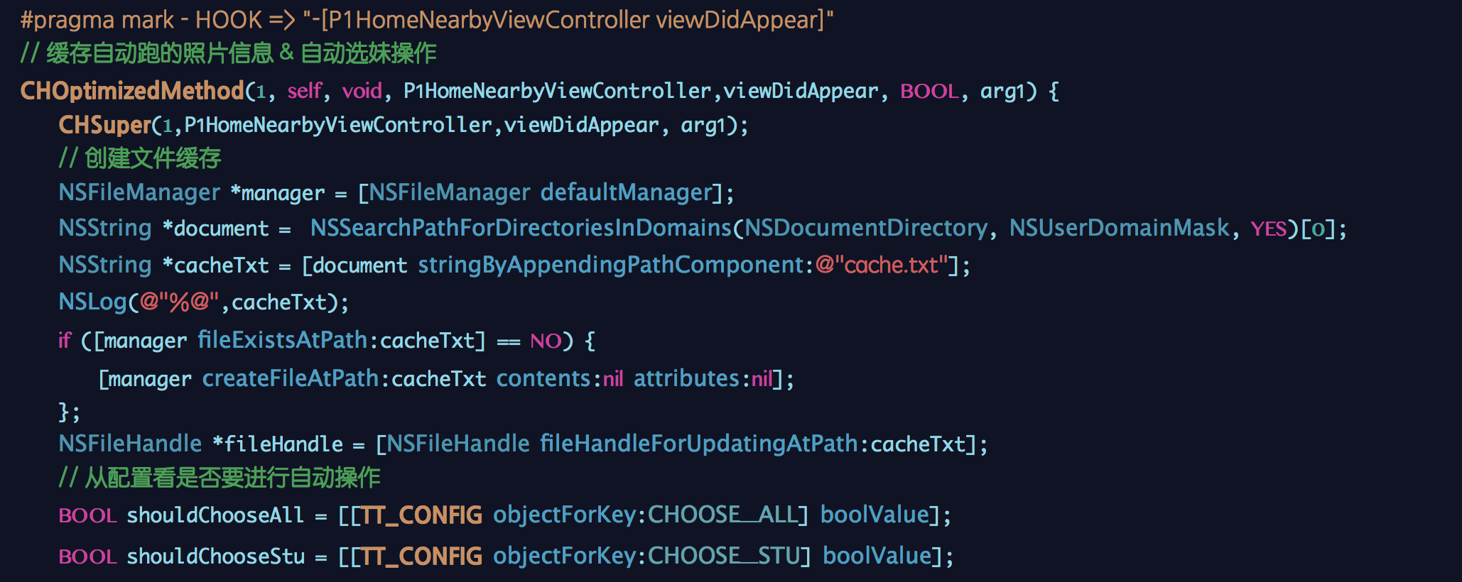 - 为了更好的效果在主页的地方选妹子,我最后采取的是模拟点击likeButton,在NSTimer中执行,当刷的人对已拉取用户求余==0的时候停止, 如果不想停止就把infinite打开,这是一个疯狂的爬取,没有停止的线性条件,除非杀APP. 为什么这么做呢, 因为我把自动拉取的信息默认是保存到Document/cache.txt里面, 主要是照片的url和部分简介