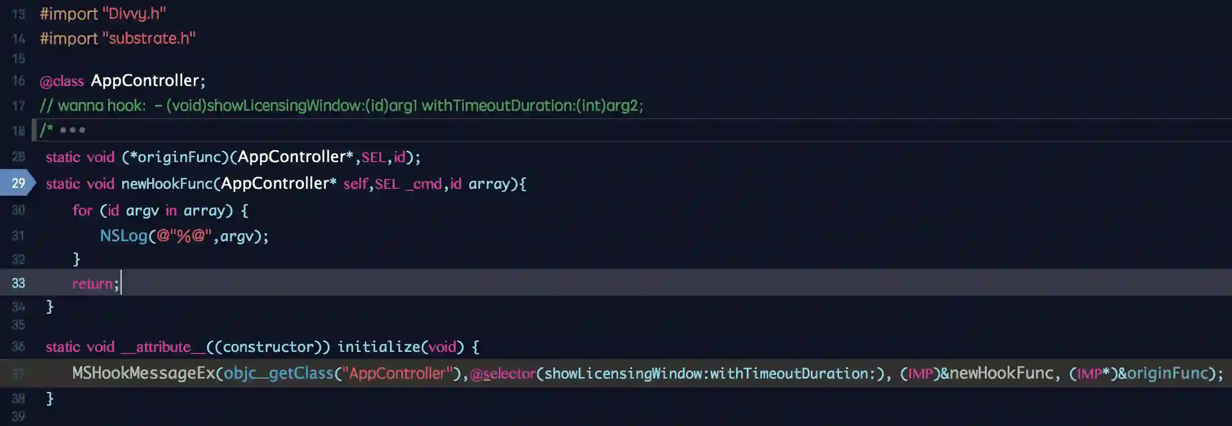 MSHookMessageEx(objc_getClass("AppController"),@selector(verifyLicense), (IMP)&newHookFunc, (IMP*)&originFunc);
