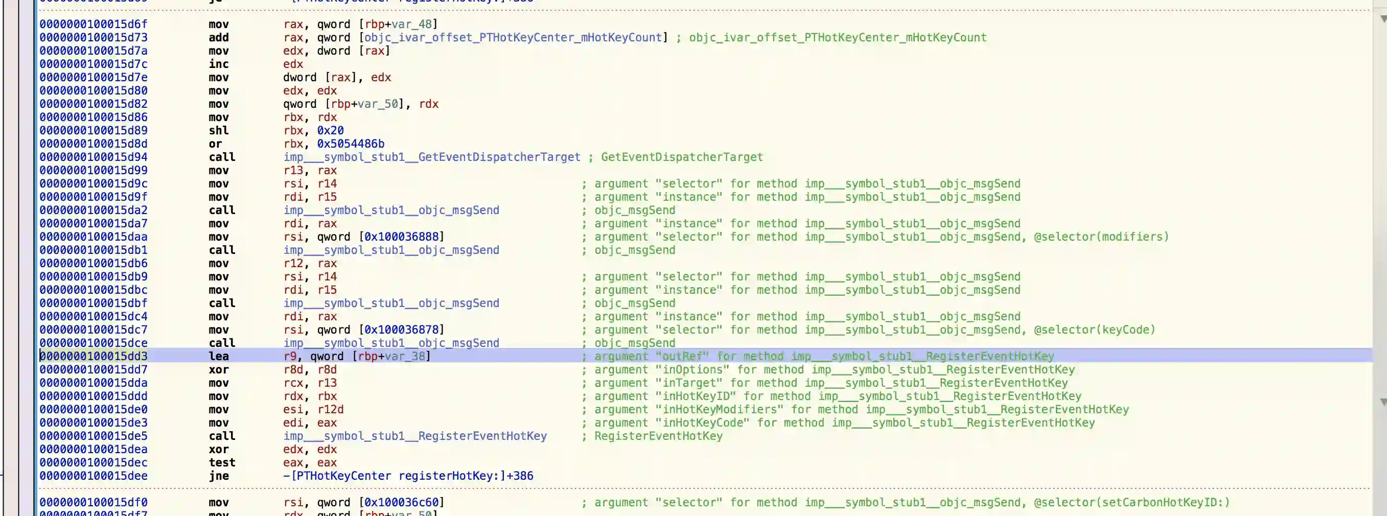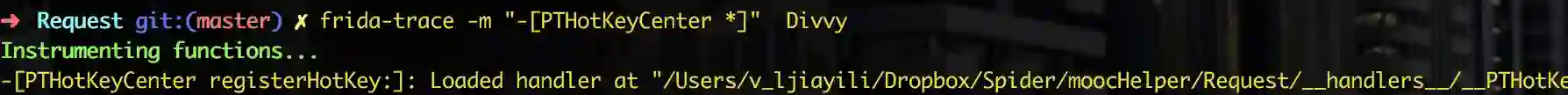 frida-trace: frida-trace -m “-[PTHotKeyCenter _]” Divvy